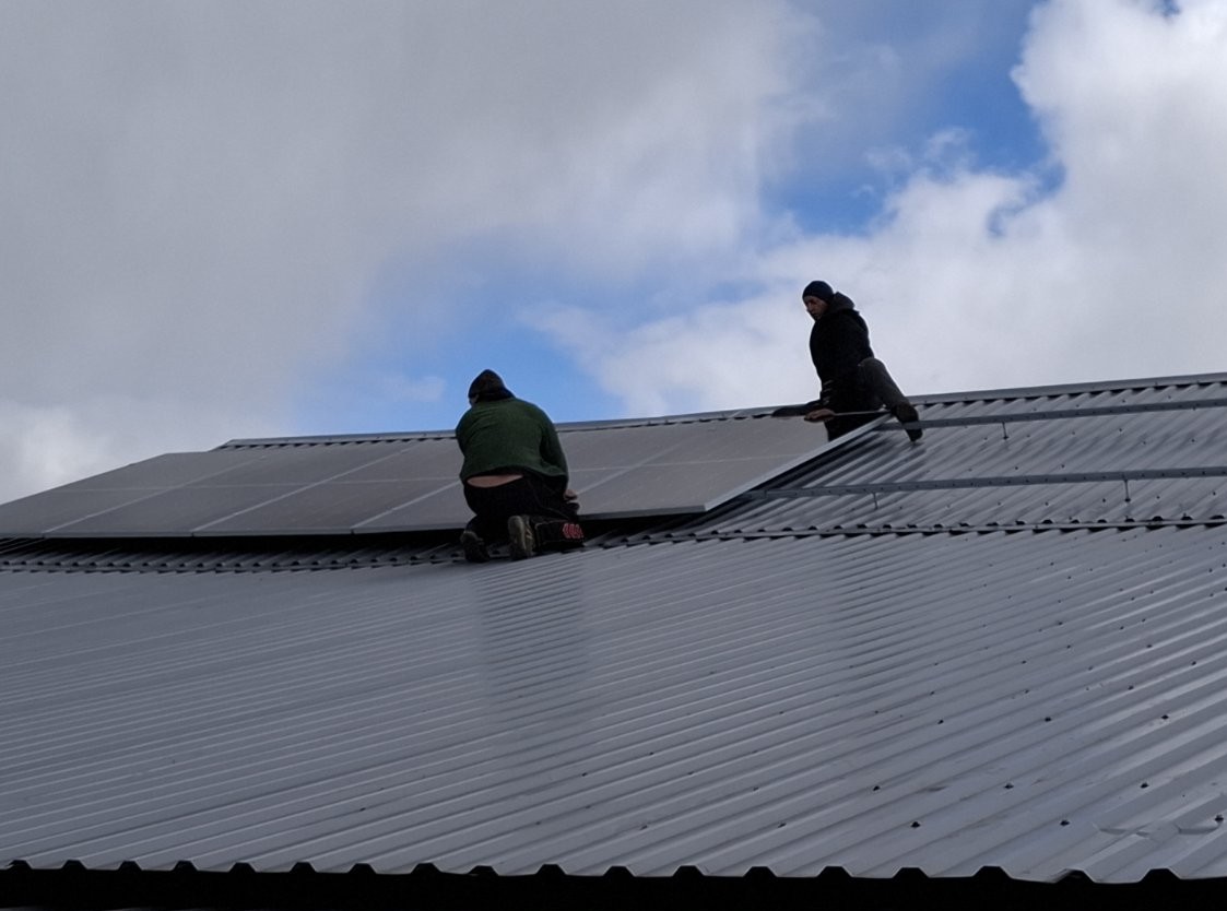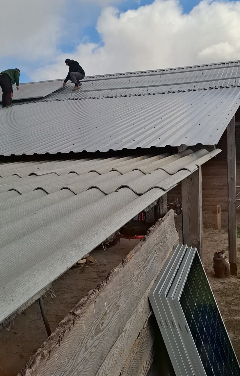 Сонячна електростанція для приватного будинку, фотомодулі встановлені на похилий дах з металевими покрівельними панелями. Система повністю забезпечує будинок електроенергією в сонячні дні. Інвертор та акумулятори розміщені всередині будинку.
